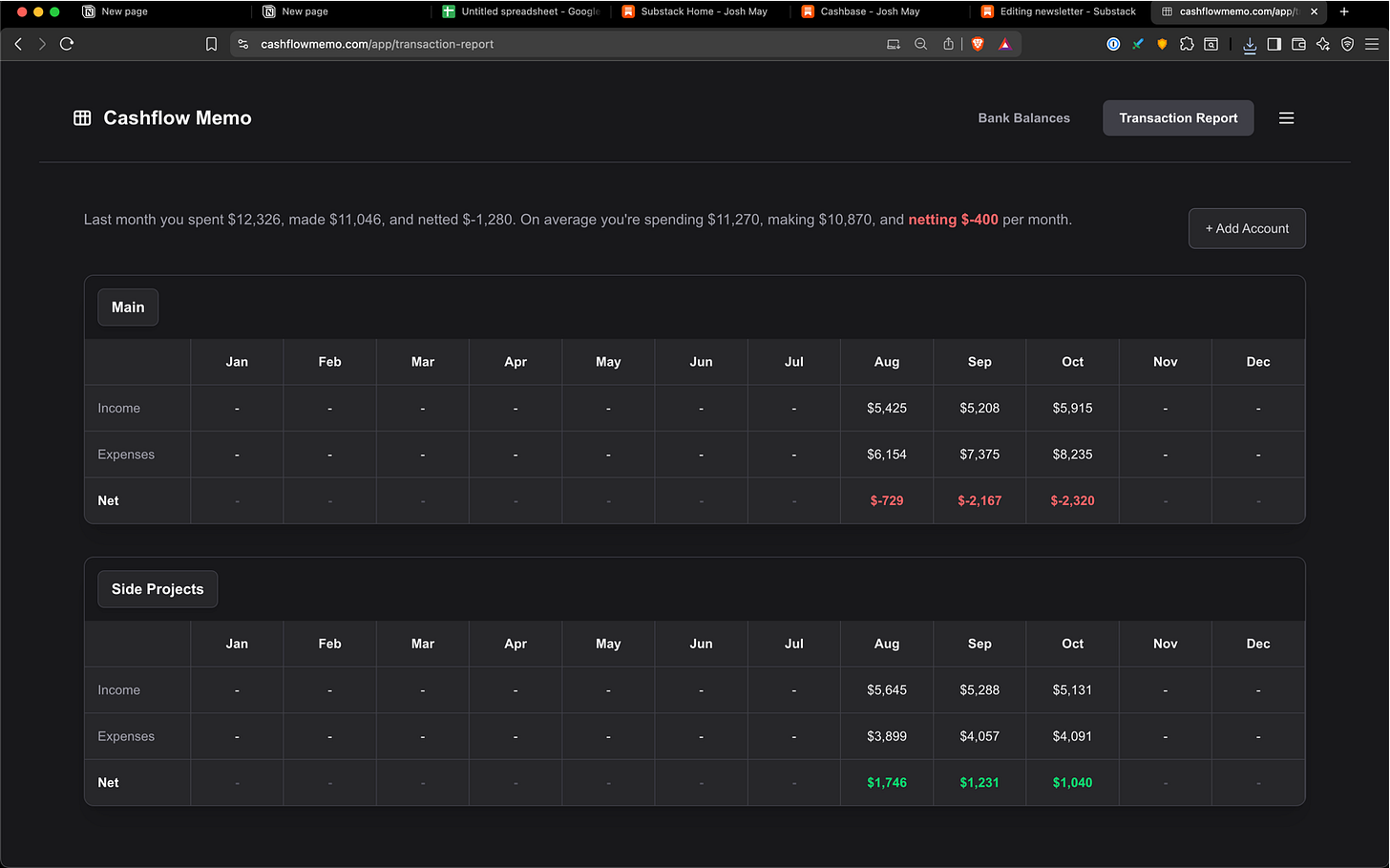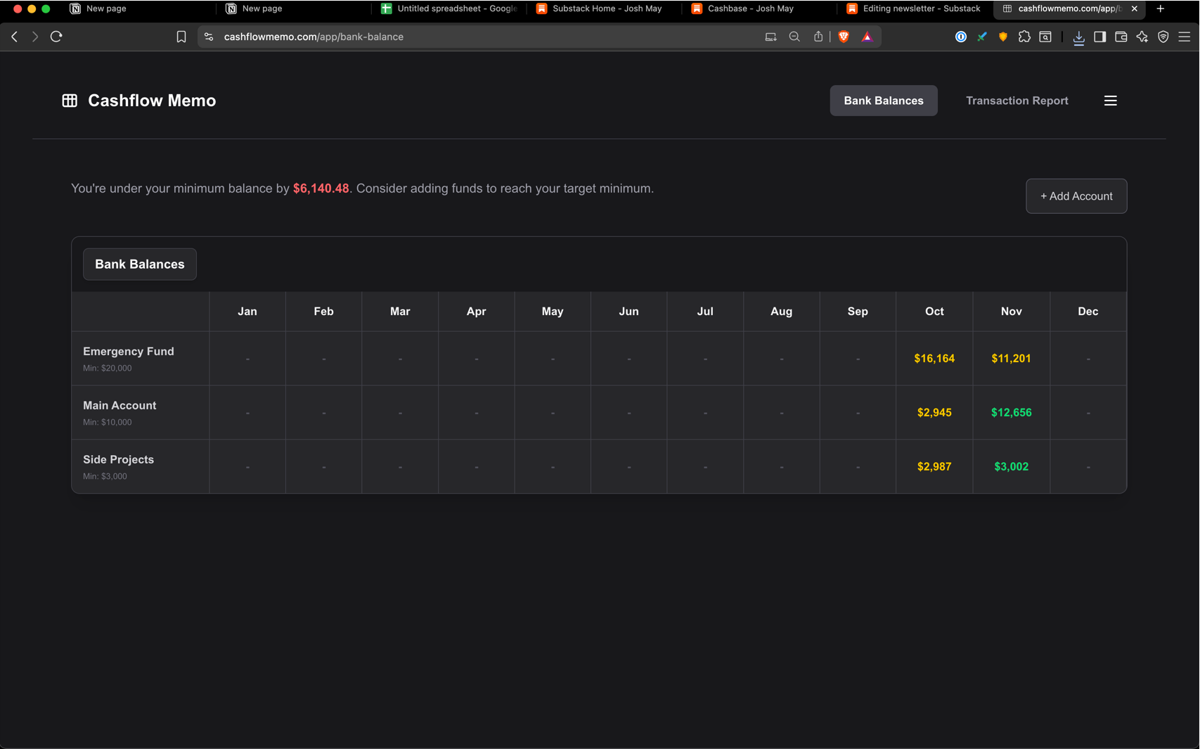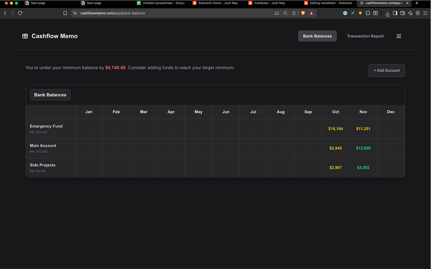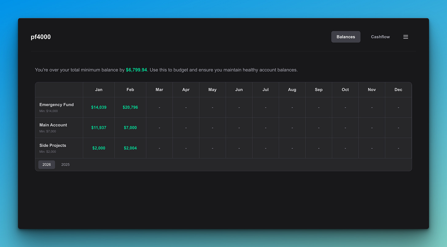 idea: this tool does two things. one, it aggregates your personal finance data (credit cards and bank info) into one dashboard. and two, it sends you a monthly email showing you how much is in your bank and if youre above or below the bank account minimums youve set.