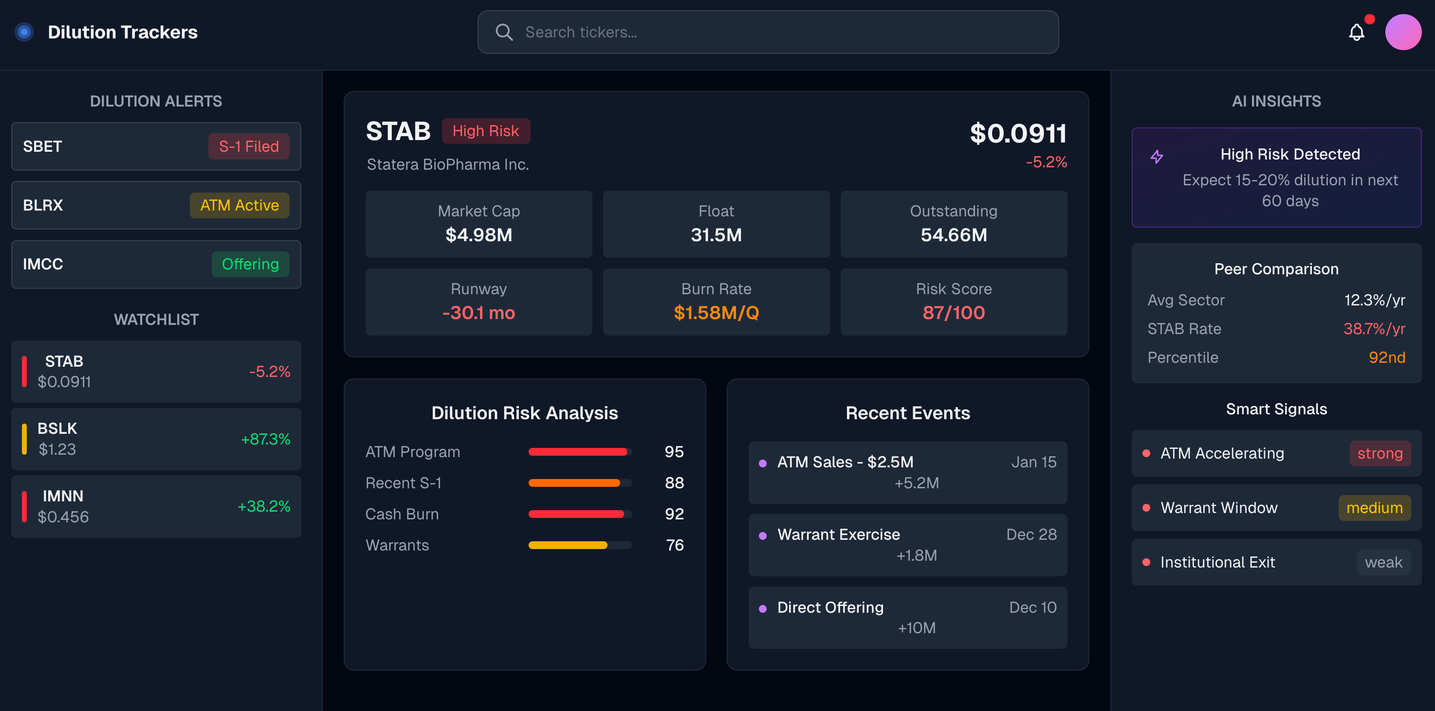 We pull data directly from SEC filings and synthesize it with stock information to give you a clear, immediate picture of a company’s dilution risk.