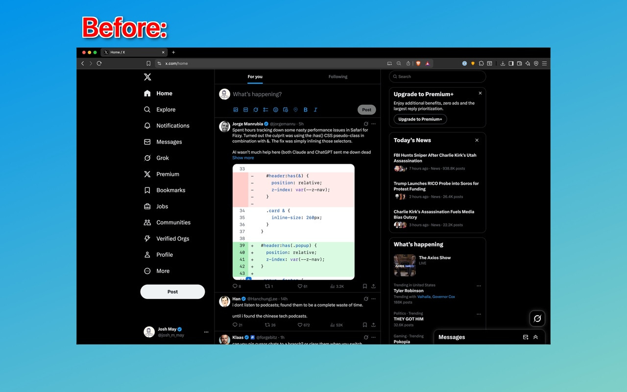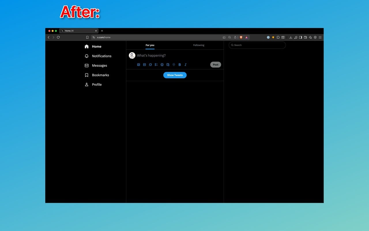 idea: hides the x feed on page load and hides annoying left and right side elements.